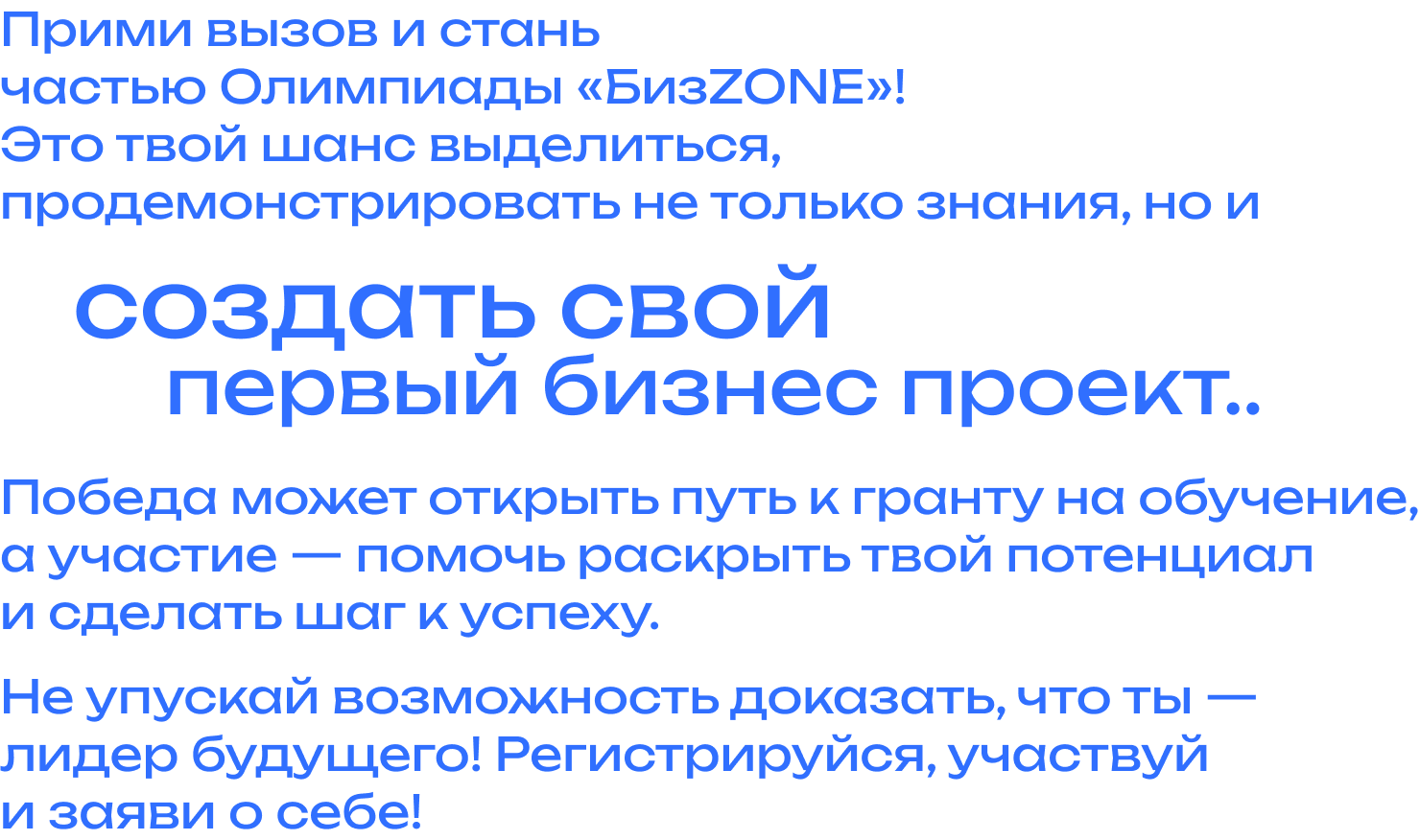 Бизнес-олимпиада БизZONE — это олимпиада, приняв участие в которой участник раскрывает и реализует свой потенциал, развивая при этом навыки генерации бизнес-идей. Практика в написании бизнес-плана еще до поступления в Университет в рамках данной олимпиады дает несомненное преимущество среди сверстников, а также положительно влияет на критическое и аналитическое мышление.